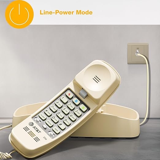 The AT&T 210 trimline telephone is designed for hassle free use. This durable corded phone features a three ringer setting, tone/pulse dial and illuminated keypad. The 210 offers a 10 number memory dial which allows you to store your most important contacts. A directory card is also provided to help you keep track of all your memory dial settings. 210 Features: Trimline Corded Phone Single Line Operation Hearing Aid Compatible Wall Mountable Backlit Keypad 3 One-Touch Memory Buttons 10 Station Speed Dial Handset Volume Control Redial Mute Flash No Power Adapter Required