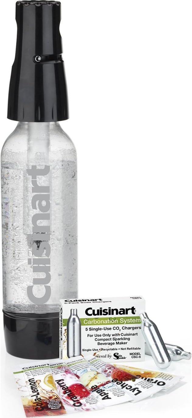 Starter kit includes one-liter BPA-free beverage bottle, 5 pack of Cuisinart single-use CO2 chargers, 10 flavor packets